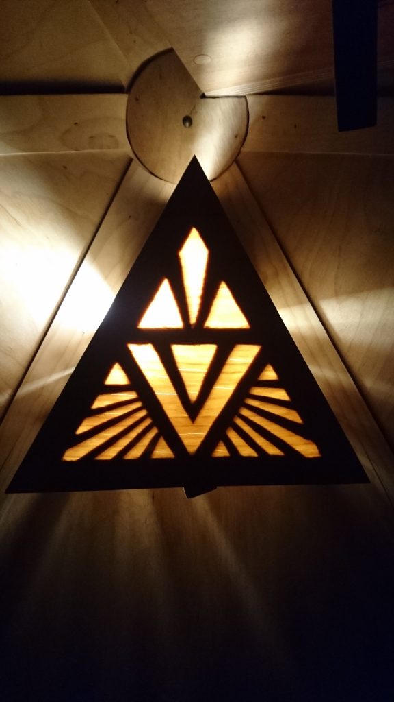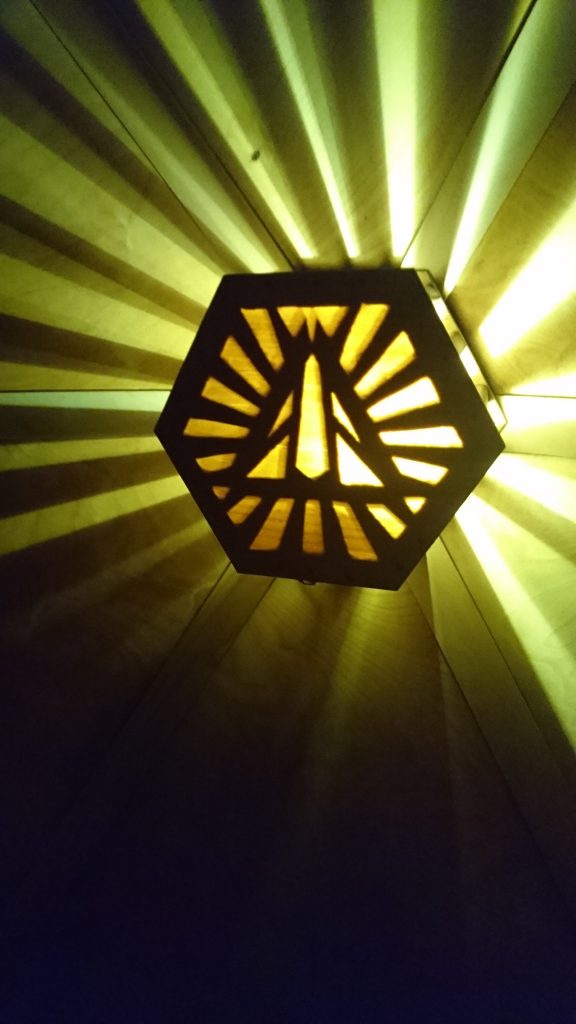 Tamen tion oni ne povas vidi tage. La arto nur videblas kiam malhelas kaj la lampoj ŝaltatas. Kiam helas nur la ligna surfaco videblas – vi povas rigardi la malŝaltatan seslateran lampon en unu de fotoj kiuj troveblas per la supra ligilo.