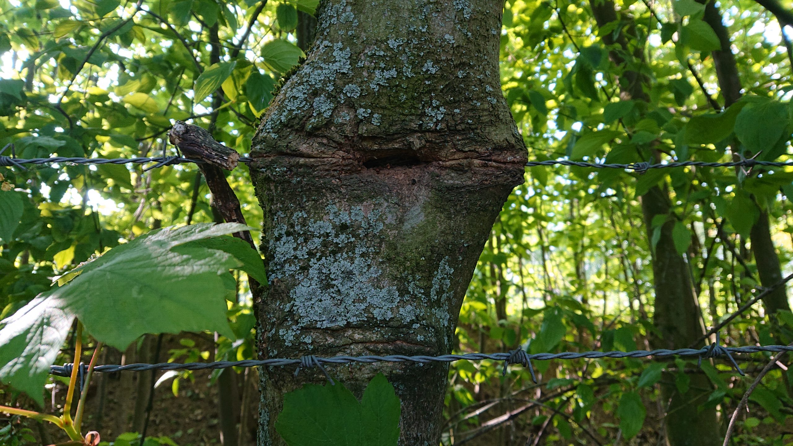 La juna arbo cirkaŭfermas pikdraton. Se neniu faros ion tie, tiu arbo – kaj multaj aliaj tie – malrapide tamen certe detruos la barilon. Mi ne opinias ke tio parto de la arbo estas bela. Ĝi similas cikatron. Tamen ĉiuj arboj kune je tiu loko aspektas kiel normala juna arbaro. La naturo prenas kion apartenas al ĝi. Tio belas.
