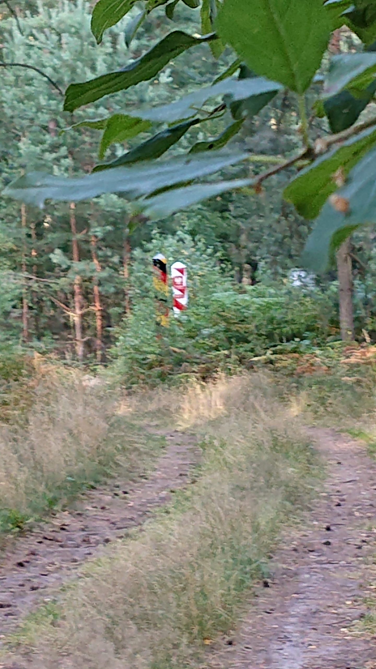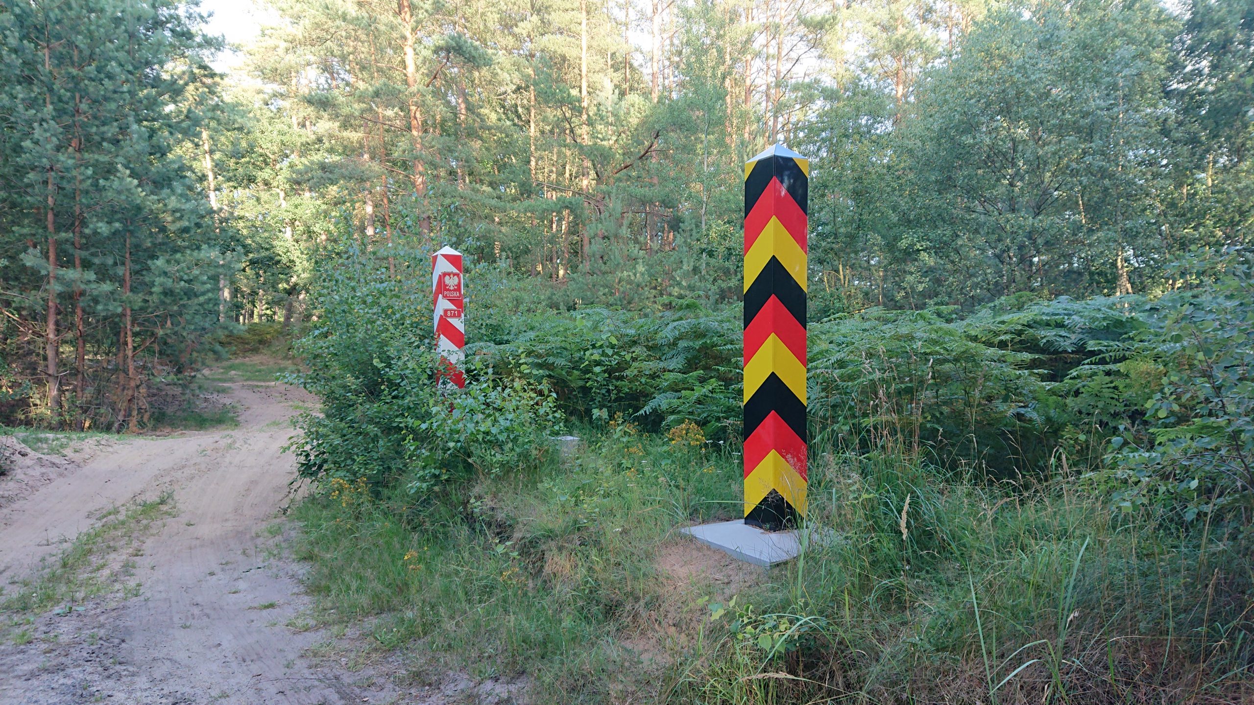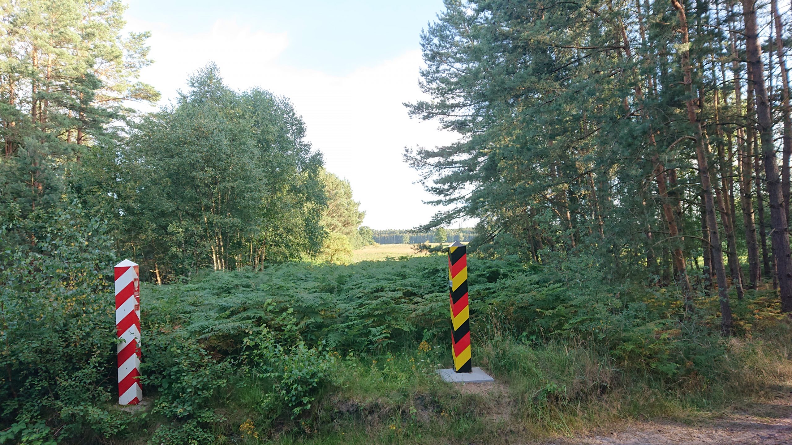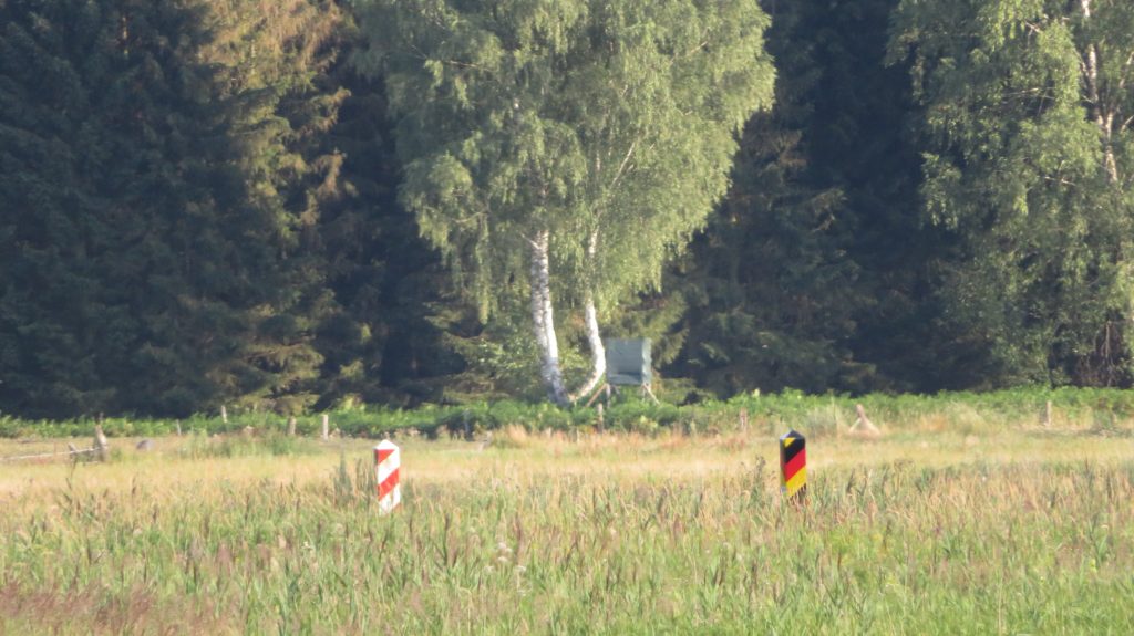 Preskaŭ unu jaro poste: Pro la kronvirusa krizo estis fermataj plimultoj de limoj en Eŭporo. Ankaŭ vojaĝoj estis tre limitataj dum la printempo de 2020. Nun, ni somerferias en la plej nordorienta parto de Germanio, nur malmultajn kilometrojn fore de la Pollando. Niaj gastigantoj konsilis al ni picojn, kiujn faras sabate malgranda restoracio en la vilaĝo Hintersee. De tiu vilaĝo nur estas du kilometrojn tra arbaro al la landlimo. Do mi biciklis tiujn du kilometrojn – pro la mola sablo mi ankaŭ devis puŝi iomete. Finfine tion mi vidis: