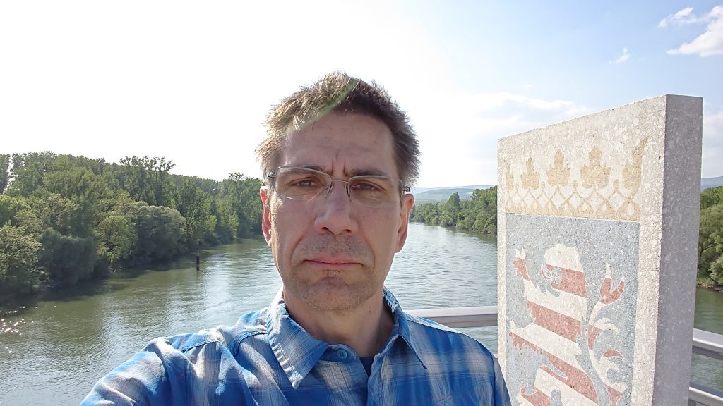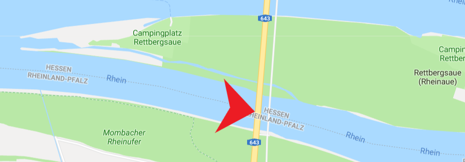 Ĉi tie la Rejno estas la limo inter la Germanaj subŝtatoj Hasio kaj Rejnlando-Palatinato. Ŝtonpanelo kun la du blazonoj montras kie la limo estas. Mi ŝparas al vi la aspekton de aŭtostrado – vi povas vidi la verdan maldekstran bordon kaj la insulon Rettbergsaue. Ekde la tempo de Romia Imperio la Rejno ofte estis limo inter ŝtato, provincoj ktp. Ĉi tiam la aŭtaj transiruloj apenaŭ povas vidi ĉi tiun indikon de limo.