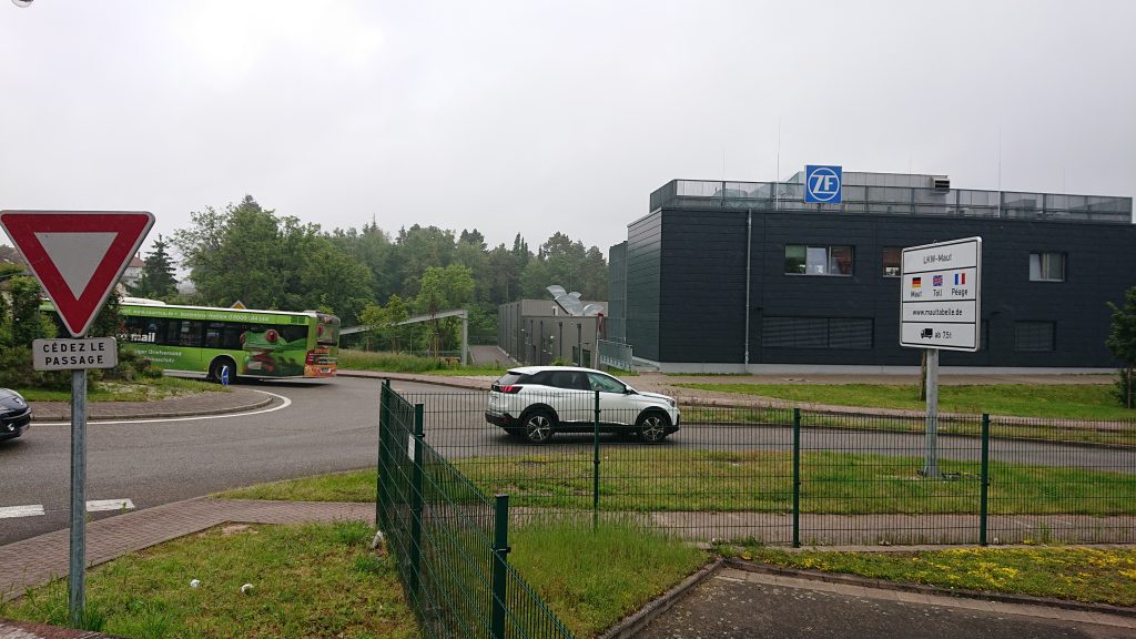 En la unua foto vi vidas trafikcirklon kaj industrian konstruaĵon. La industria konstruaĵo situas en Germanio, la trafikcirklo en Francio. Inter Saarbrücken kaj Forbach regulaj busoj iras – la buso en la foto ne ligas ambaŭ. Ĝi nur servas en Saarbrücken, sed ĝi uzas la trafikcirklo por turni.