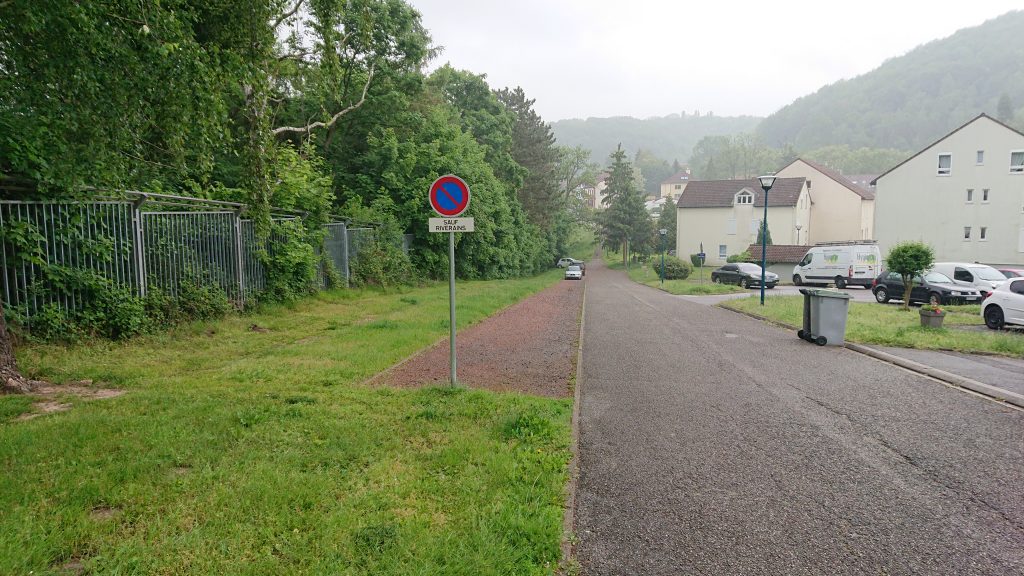 La dua bildo estis fotata ĉe la Franca flanko, nur tri cent metrojn norde de la trafikcirklo. La domoj, la vojo kaj la herbejo situas en Francio – maldekstre, malantaŭ la barilo troviĝas la ĉefa tombejo de Saarbrücken. La tombejo ekzakte apudas la ŝtatan limon.