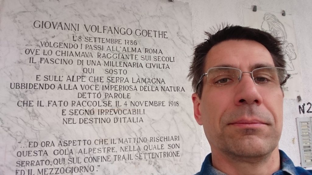 Mia familio transiris la Montpasejo Brenero trajne en printempo de 2016 por ferioj en norda Italio. Tiu loko estas malnovega pasejo inter la norda kaj la suda parto de Alpoj. Por ekzemple Goethe vojaĝis al Italio tiel. En Germanio ĉiu loko, kiun Goethe visitis, havas informan panelon. Tiu foto pruvas ke ne nur en Germanio, sed ankaŭ ĉe la Itala flanko de la limo inter Italio kaj Aŭstrio:
