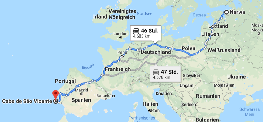 El Narva al la plej sudokcidenta loko de Eŭropo – la Cabo de São Vicente – vi nuntempe povas iri sen kontrolo de la pasporto. Tio estas proksimume 4.700 kilometroj kaj naŭ landoj. Tamen ankaŭ el la urbo Ivangorod je la rusa flanko de la rivero Narva al la urbo Vladivostok je la pacifika bordo ne estas ŝtata limo – tio estas proksimume 9.700 kilometroj. En tiu senco la limo je la rivero Narva estas la ununura vera limo sur unu ebla vojo inter la Atlantiko kaj la Pacifiko. Dankon al Guglaj mapoj:
