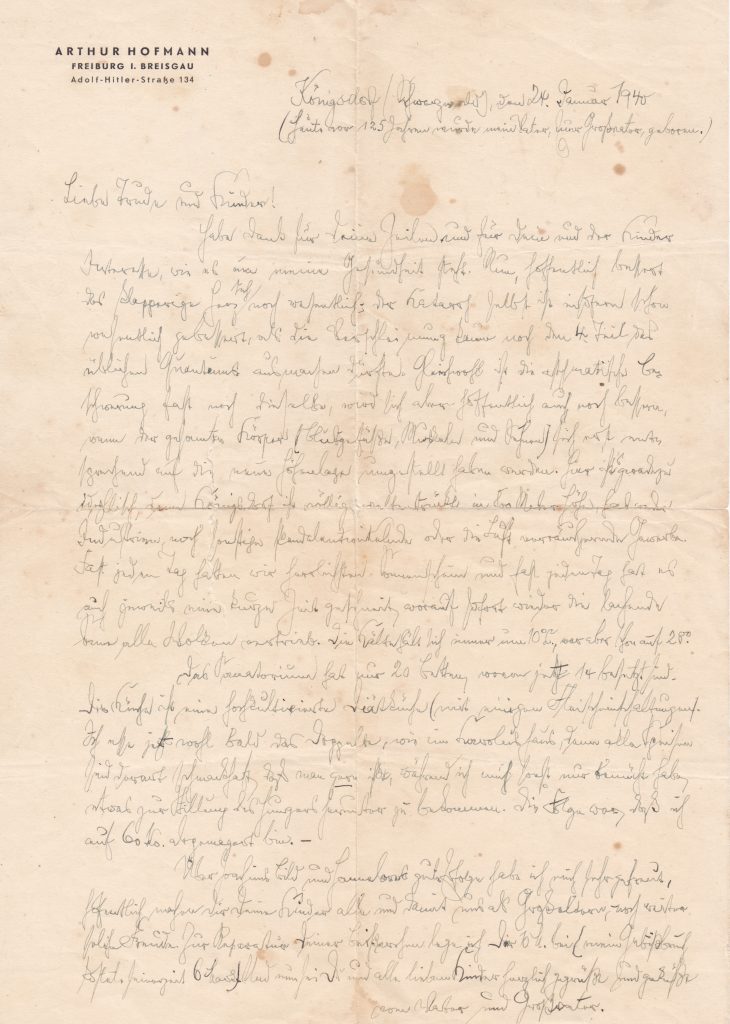 Unu aĵo el la materialo estas letero, kiun mia prapraavo Arthur Hofmann skribis en Januaro 1940 al sia filino Getrude kaj ŝiaj gefiloj. La unua edzo de Getrude estis Fritz Zietsch, pri kiu mi – inter alie – skribis ĉi tie. Arthur Hofmann ankaŭ estis delegito de germana parlamento Reichstag, li ankaŭ havis publikajn postenojn en la subŝtato Thüringen. Vi povas trovi afiŝon en la germana vikipedio.