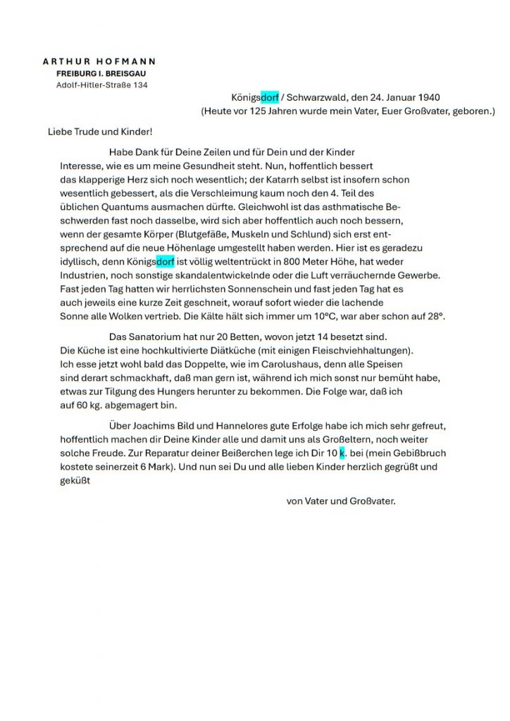 Daŭris al mi kelkajn horojn alveni al teksto, pri kiu mi pensas ke ĝi sufiĉe kvalitas. Mi uzis artefaritan intelekton denove dufoje. La unua demando estis pri la loko, el kiu Arthur Hofmann skribis la leteron. Li – klare rekoneble – skribis Königsdorf / Schwarzwald. Tamen ne estas unu Königsdorf en la Nigra Arbaro. La plej proksima Königsdorf estas en Bavario. Nu, Kopiloto de Mikrosofto ebligas demandi pri iuj lokoj en la Nigra Arbaro kies nomo enhavas la vorto König. El la resultoj, nur Königsfeld kongras kun la enhavo de la letero (havas sanatorion, situas je prok. 800 metroj smn). La dua demando estis pri la nuna nomo de la strato, kiun Arthur Hofmann donis je la komenco de la letero kiel sia adreso. Klaras, ke ĝi estis renomigita post 1945. Kopiloto ankaŭ trovis tiun informon senprobleme. La strato hodiaŭ nomiĝas Kaiserstraße – kiel ankaŭ antaŭ 1933. Ni nur povas supozi kion la maljuna Arthur Hofmann sentis kiel eksa socialdemokrata politikisto pri tio ke li devis loĝis en strato kun nomo Adolf Hitler.
