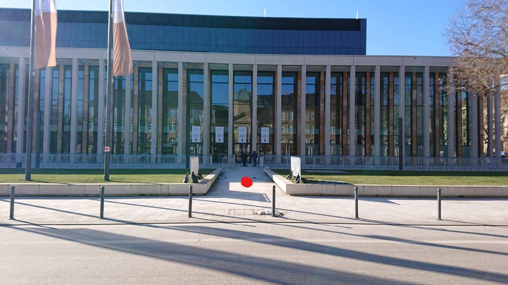 Tuj poste ano de la Visbadena policeto*1 eliris la domon kaj postulis ke mi malmemoru la foton de mia poŝtelefono kaj mi montru al li mian legitimilon. Ĉar tiu loko apartenas al la privata areo de la centro. Mi demandis ĉu – kaj li konsentis ke – konsekvence la foto de la mezo de la apuda strato (tiun vi nun povas vidi supre) estas legitima.