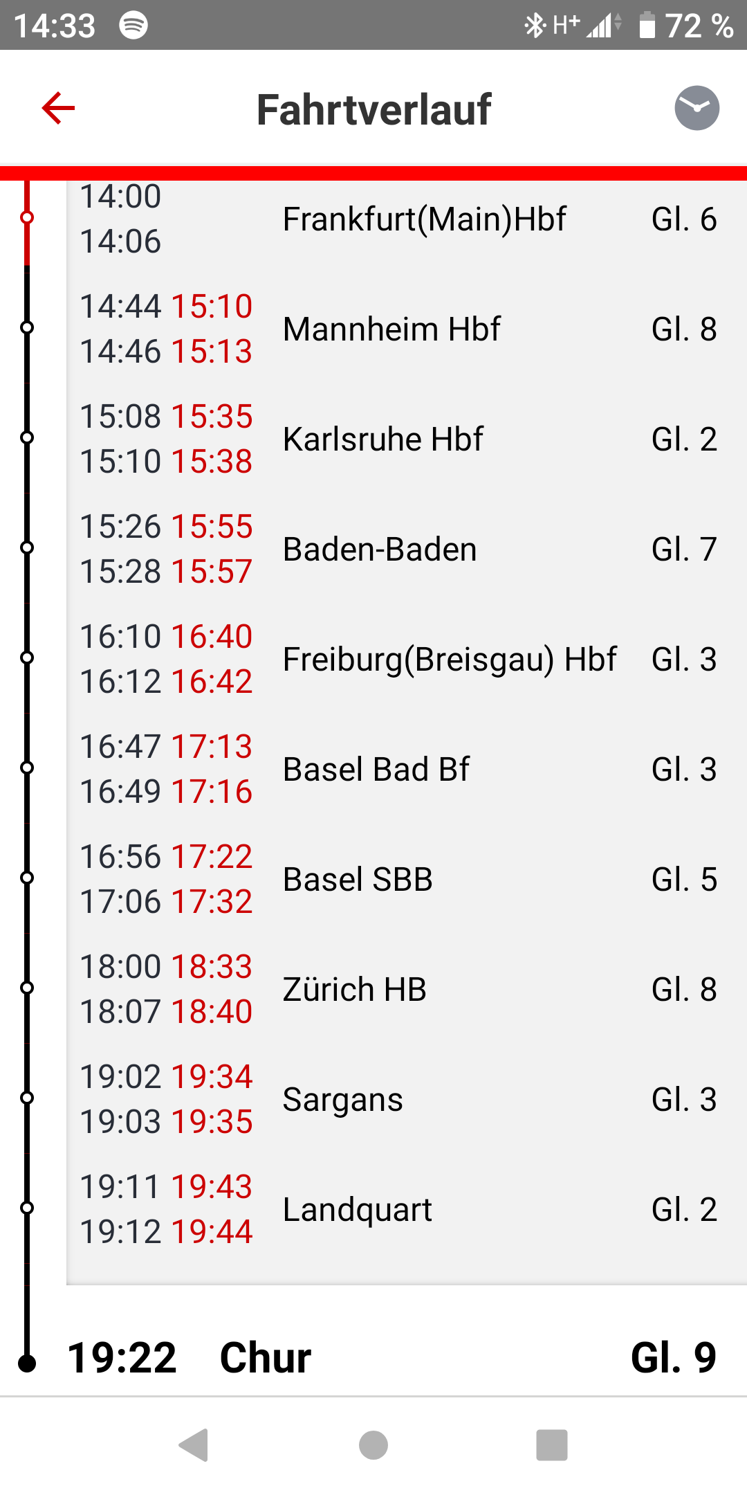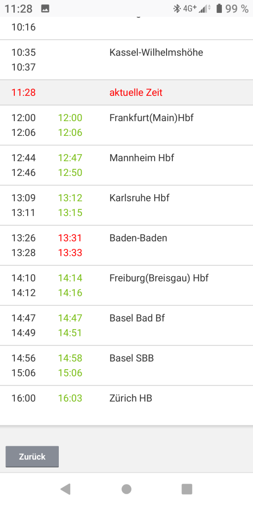Mallonga mesaĝo je la dua kaj kvardek minutoj, preskaŭ en Svislando: La trajno, per kiu mi devus iri laŭ la plano de Deutsche Bahn jam estas malfruanta. Se mi decidus por ĝi, mi devus havi tre fortajn nervojn – kiujn mi ne havas.