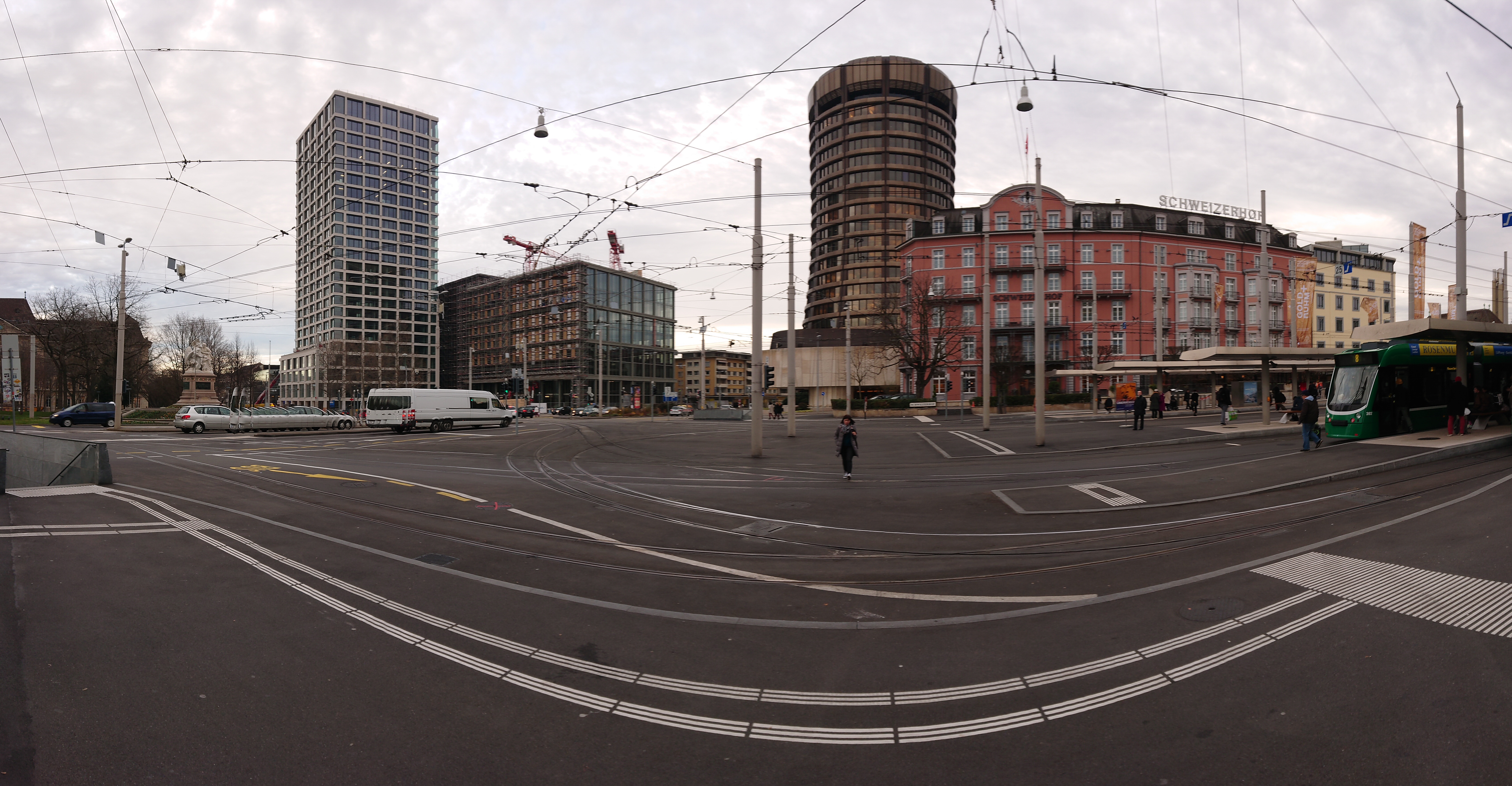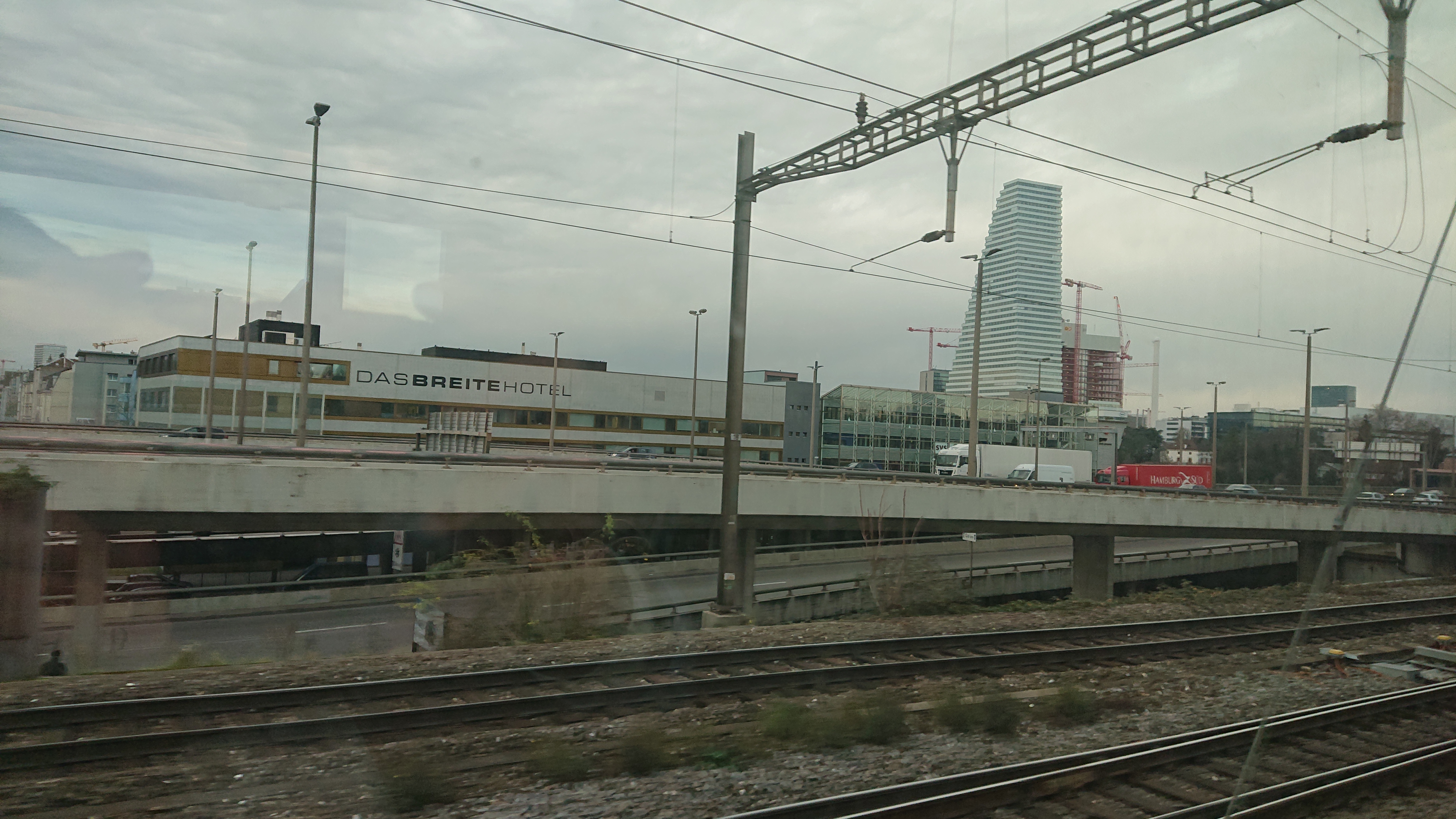 La tria kaj duono: Alveninte en Bazelo akurate. Atendas nun en kafejo la trajno al Milano. Jen fotoj de la industria urbo.