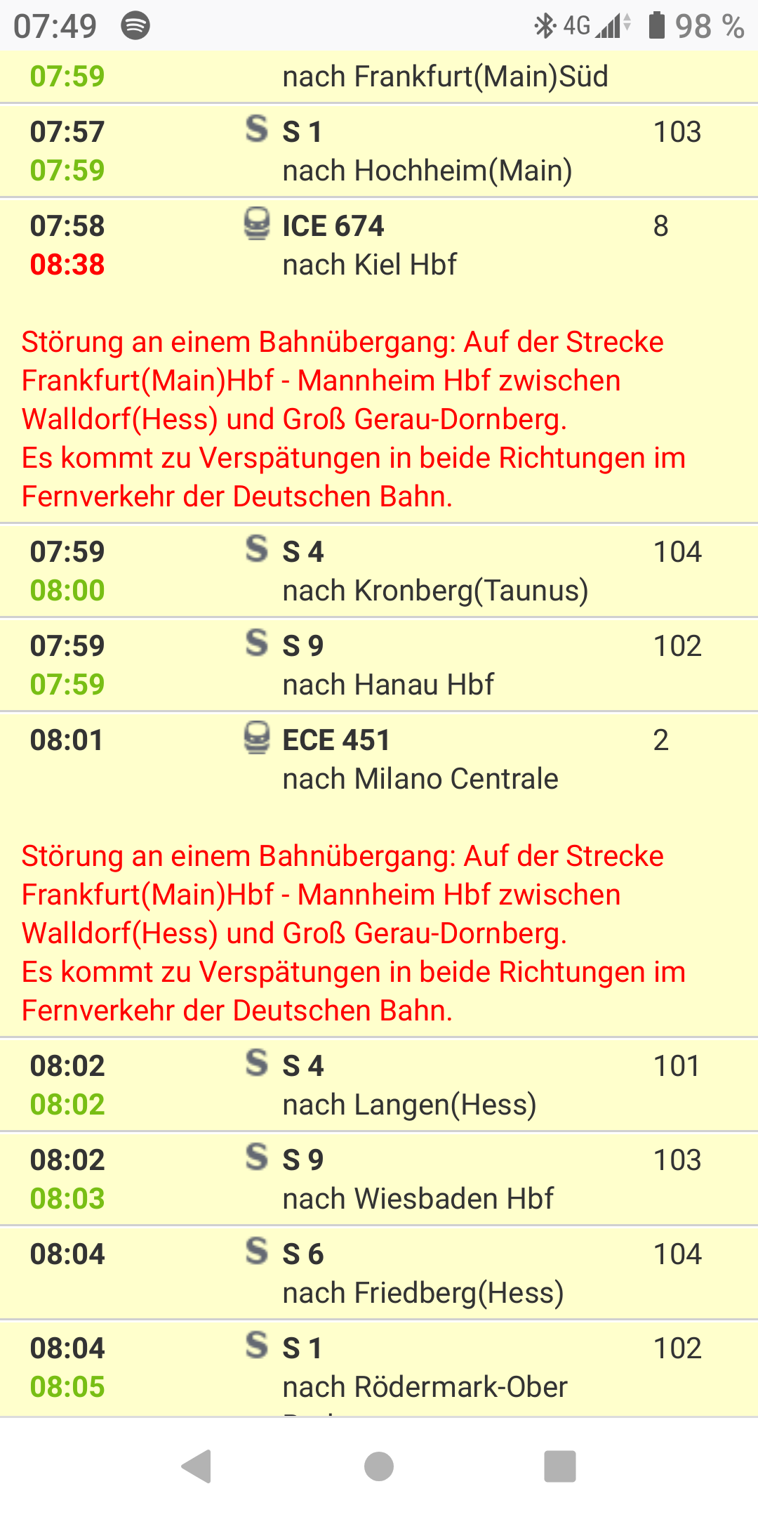 Mateno, preskaŭ la oka. Mia fervoja tago promesas esti malenua. Kelkaj malproksimaj trajnoj el Frankfurto ŝajnas esti malfruaj. Precipe mi vidu la averton por la trajno al Milano: Difekto ĉe nivelpasejo. Mia trajno al Bazelo ankaŭ devos pasi tiun lokon…